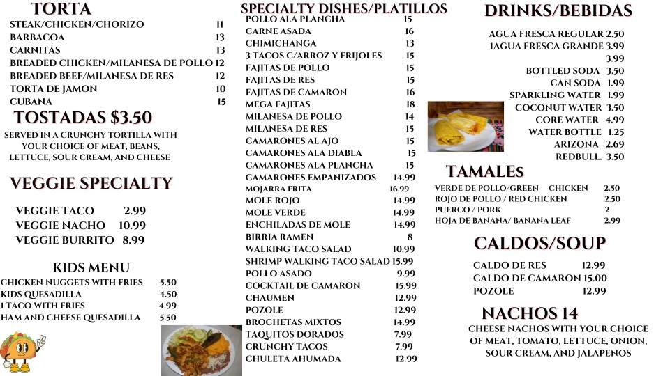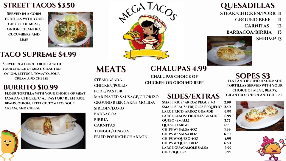 If you're craving bold flavors and hearty meals, you’ll want to explore the Mega Tacos Menu. Located at 9211 Crawfordsville Rd, Indianapolis, IN, this spot brings tacos to a whole new level. Whether you're in the mood for a classic taco or something with a bit more flair, there’s something to satisfy every taste. From tender meats and zesty salsas to fresh toppings, each bite packs a punch of flavor that keeps you coming back for more. Not just for taco lovers, their menu also features a variety of sides and salsas to complement your meal perfectly. It’s the kind of place where every dish feels like it’s made with care, and each taco is a little moment of happiness in your day. Come by, dig in, and let your taste buds do the talking!
